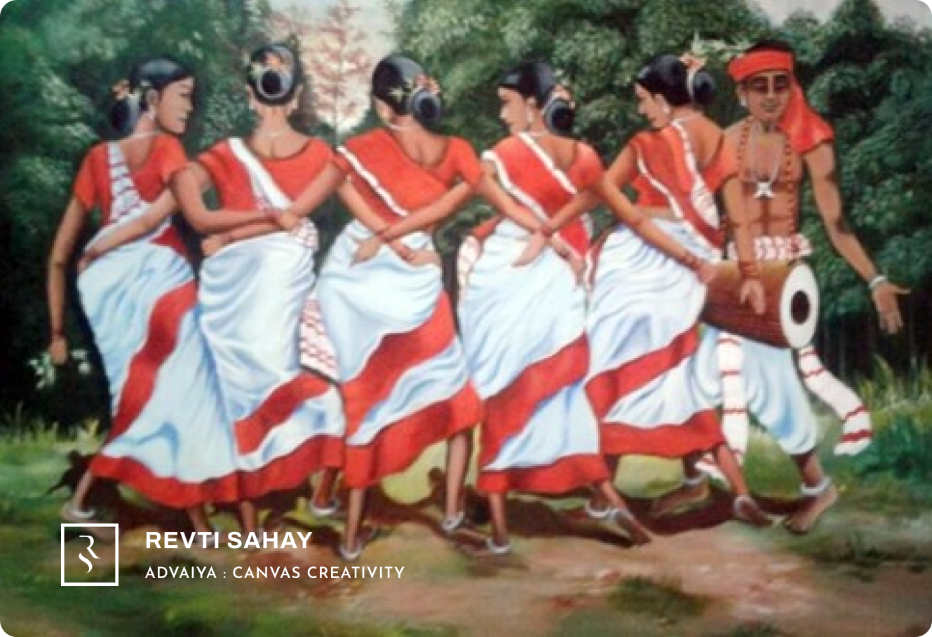 This vibrant group tribal dance, a cherished ritual of Ranchi, Jharkhand, was captured and brought to life on canvas by the artist. Celebrated during weddings and festivals, this traditional dance embodies the spirit of community, rhythm, and culture, showcasing the rich heritage of tribal traditions through graceful movements and vivid expressions.