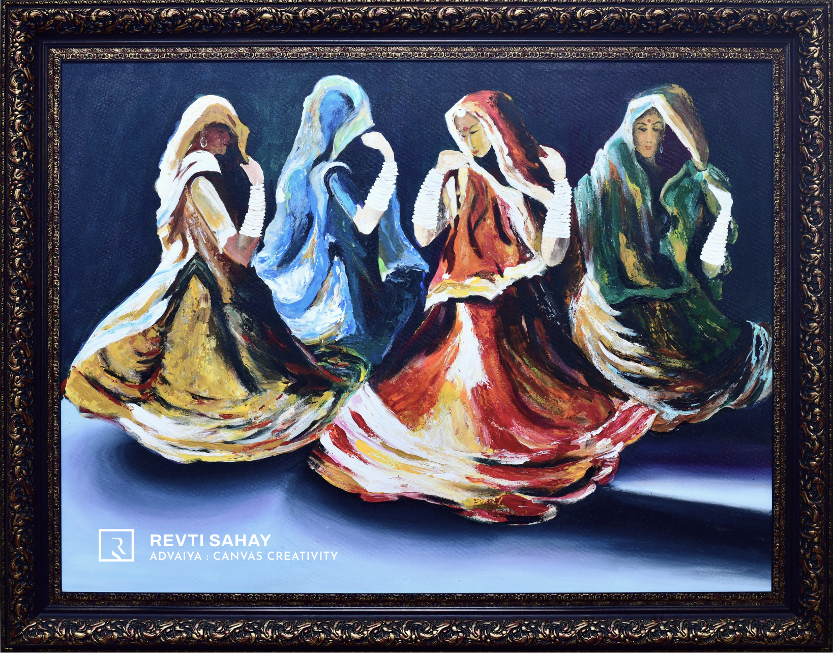 Gabra Dance is a vibrant recreation of a traditional cultural masterpiece, capturing the rhythm, energy, and exuberance of this spirited dance form. The painting brings to life the joy and cultural essence of the Gabra dance, with each movement symbolizing unity, celebration, and tradition. Through dynamic brushstrokes and vivid hues, it conveys the flow and vibrancy of the dancers, honoring the original art form while infusing it with a sense of life and movement (Recreate).