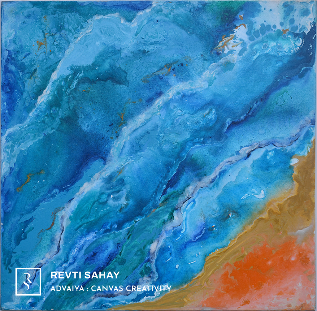 This vibrant painting This vibrant acrylic painting on canvas captures the dynamic essence of the ocean’s movement as it meets the shore. Swirling shades of blue and turquoise blend seamlessly, mimicking the dance of waves crashing onto the sand. Hints of gold and white add dimension, suggesting sunlight reflecting off the water’s surface, while the warm orange and sandy tones in the corner contrast beautifully, symbolizing the earth’s embrace of the ocean. This painting allows the viewer to feel the power, tranquility, and endless motion of nature.captures the ocean’s dynamic movement meeting the shore, with swirling blues and turquoise blending seamlessly. Hints of gold and white reflect sunlight, contrasting with warm sandy tones.