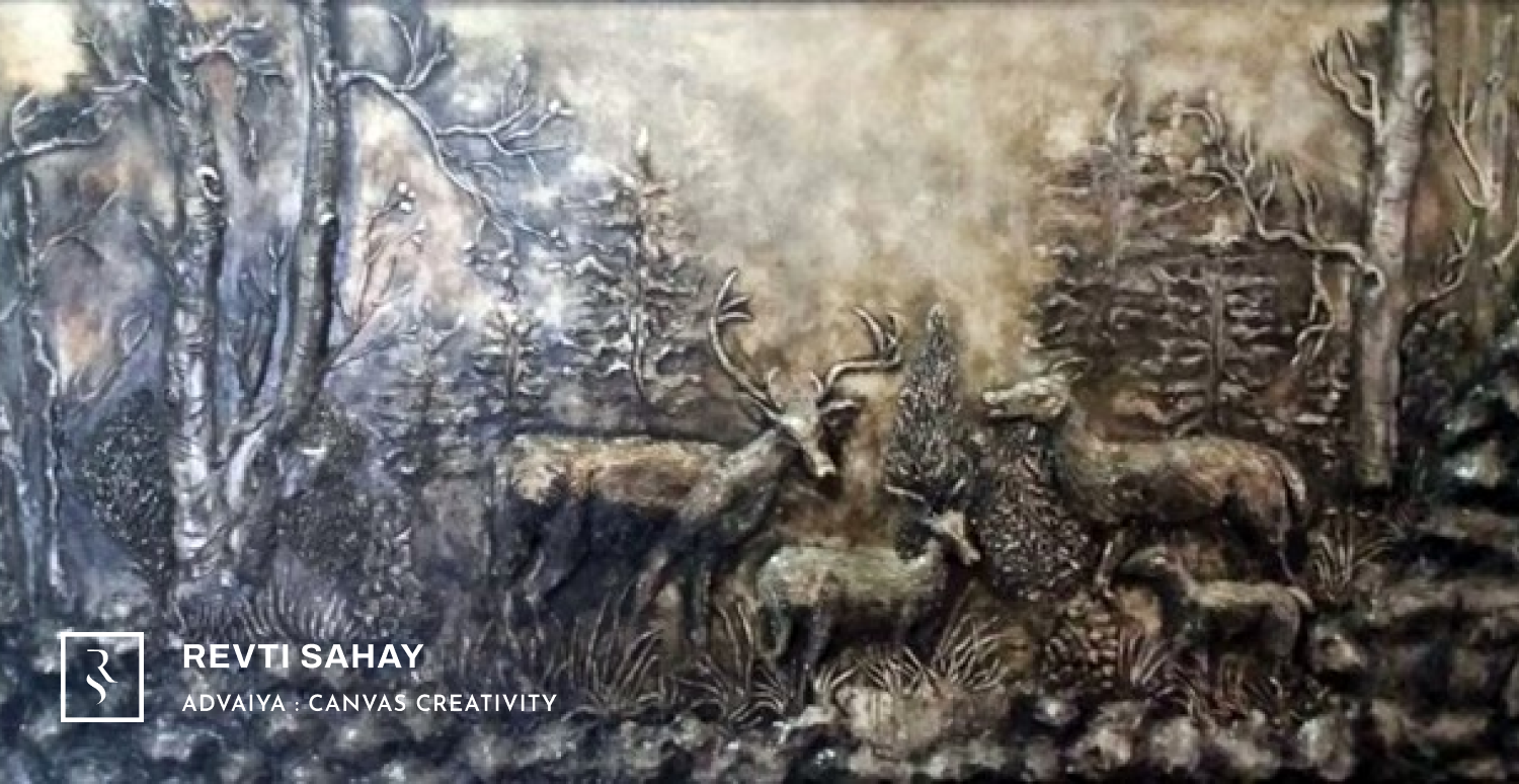 This imaginative artwork brings to life a serene jungle scene featuring a herd of deer, crafted with a unique two-dimensional approach. Using a combination of materials, the artist has infused the piece with a tactile quality, allowing viewers to not only see but feel the texture of the wild. The layered composition captures the essence of nature, evoking a sense of depth and connection to the wilderness.