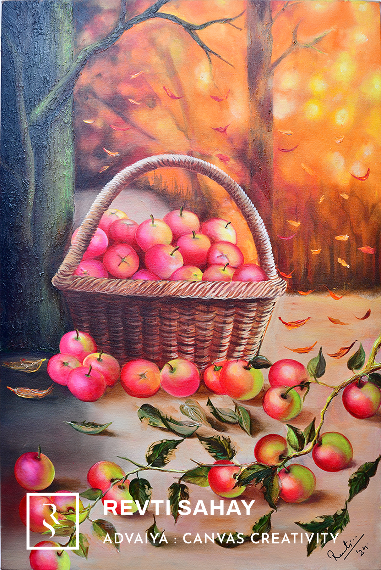 The painting depicts a basket filled with vibrant, colorful apples, in a lush orchard. The apples, with shades of red, green, yellow, and orange, showing their fresh, ripe appeal.