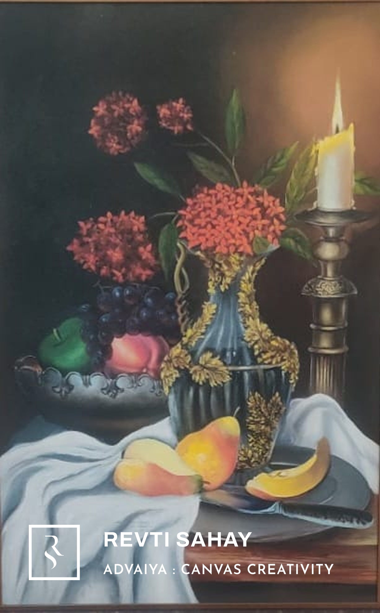 A still life showcasing a bountiful harvest kept in a fruit bowl near a flickering candle. Surrounding the basket, colorful blooms adds a touch of elegance. Bathed in the warm glow of a flickering candle lamp, the soft light is enhancing the depth and texture of the fruits and flowers. The flower pot is elegant design with a frosted glass shade, adding a touch of rustic charm. Textures, and the interplay of light and shadow.